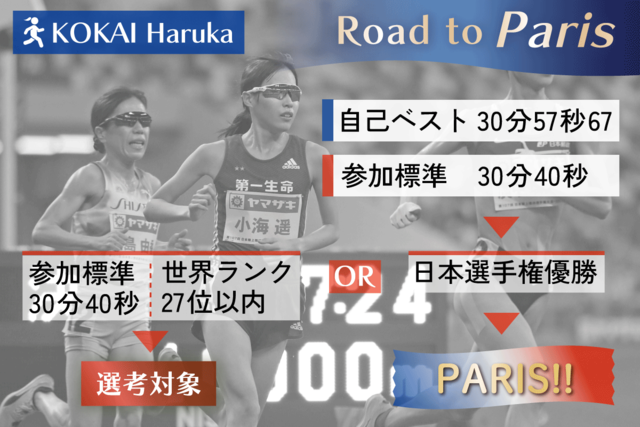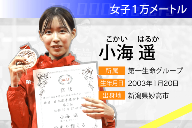 女子1万メートルの小海遥(妙高市出身・第一生命グループ)は23年12月、日本選手権1万メートルで30分57秒67で3位に入った。参加標準記録に17秒まで迫るタイムだった。いずれも参加標準記録の突破を目指しながら、世界ランクの上昇を目指す。