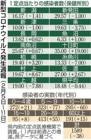 新潟県は2月15日、県内86の定点医療機関から5〜11日の1週間に報告された新型コロナウイルスの感染者が1589人で、1医療機関当たりの平均は18・48人だったと発表した。前週(1月29日〜2月4日)の18・92人より微減し、5週ぶりに減少に転じた。
