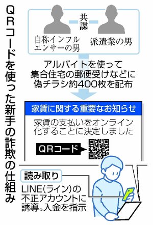QRコードをスマートフォンで読み取ると簡単に交流サイト(SNS)に登録できる仕組みを悪用し、LINE(ライン)の不正アカウントに誘導するQRコードを印刷した偽チラシを配り、現金を振り込ませる新手の詐欺が発覚した。不正なウェブサイトなどにつながるQRコードが、企業のダイレクトメールや大学の冊子に記載されていたことも判明した。