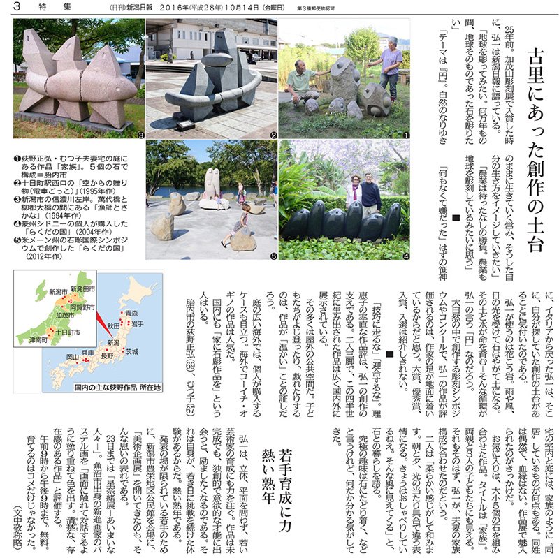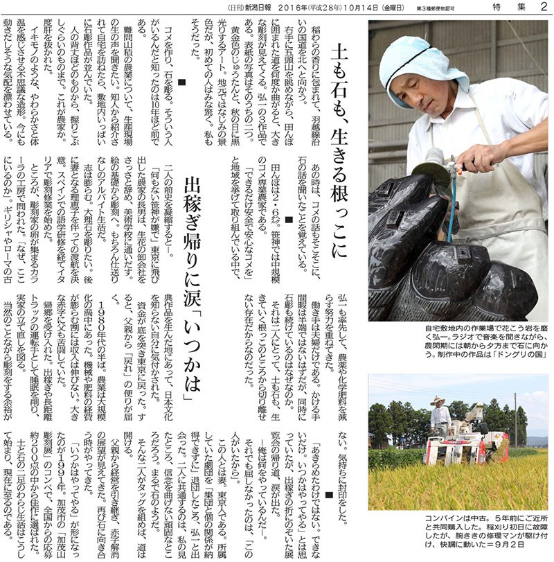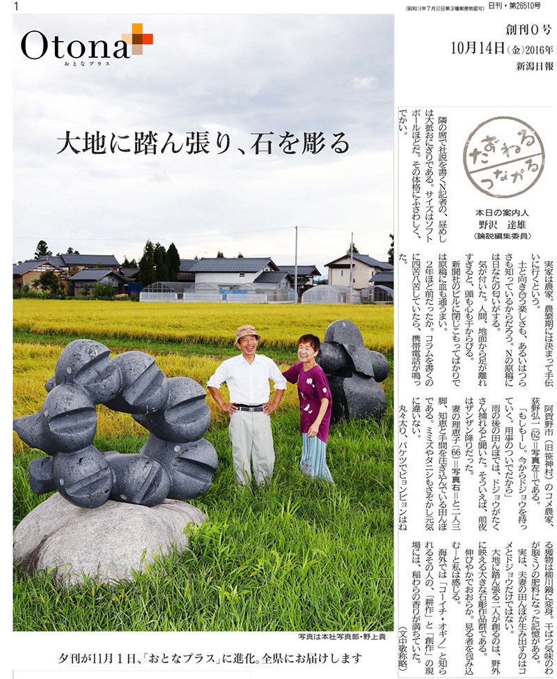 おとなプラスアーカイブ・2016年10月14日掲載 Otona+ 創刊0号 [たずねる つながる]大地に踏ん張り、石を彫る 2024/2/28 12:00 おとなプラスは2月29日付(朝刊と同時配達は3月1日付)をもって休刊いたします。2016年11月の創刊から7年余りにわたって日替わりで掲載してきたフロント特集の中から、話題を集めたいくつかの特集をご紹介します。 おとなプラスアーカイブ・2016年10月14日掲載 Otona+ 創刊0号 [たずねる つながる] 大地に踏ん張り、石を彫る ... トップページで最新情報を見る 関連ニュース 山頂に神社、小学校の屋上…各地に点在する「三角点」って?形は... 9/30 「アクシアル」「コメリ」などプライベートブランド開発の裏側お... 9/23 柏崎刈羽原発巡る県民投票、今も望む声やまず…首長らとの「意思... 9/16 【動画あり】猫と人がより幸せに暮らすには?保護猫と新たな飼い... 9/2 横綱大の里らを輩出、海洋高校相撲部はなぜ強い?厳しい基礎練習... 8/26 “最後の職人”亡き後も…紡がれ続ける「小須戸縞」 生産技術を... 8/19 「こども食堂」新潟県内で産声上げ10年、現状を白書にまとめ…... 8/12 回収した生ごみを発酵→電気と肥料に!循環社会の実現に挑む長岡... 7/29 身近に広がる「お米のプラスチック」♪ごみ袋や子どものおもちゃ... 7/22 減りゆく長岡空襲の生き証人…戦災資料館に並ぶ遺影を見て、子ど... 7/15 アツいぞ新潟の女子野球!高校や大学で続々創部、初の県人主将も... 6/24 佐渡島に“キングギドラ”がいる⁉新潟大学が大自然の神秘に挑む... 6/17 特集・連載 [新潟県の地域別感染症情報]新型コロナウイルスが増加傾向に ... 10/9 【高校入試・新潟】最新情報&お役立ち情報まとめ 倍率・過去問も 7/28 漫画で知る「うつ病」とは? 若手社員が休職→通院→復職するま... 6/13 [紅葉スポット×花スポット]新潟県内の紅葉や花畑、映える名所... 5/29 【猫動画あり・新作追加】新潟県内「猫のいる店」♡モフモフに触... 8/27 [WEリーグ]今からでも間に合う!アルビレックス新潟レディー... 8/14 【機動戦士ガンダムジークアクス】鶴巻和哉監督(五泉市出身)が... 8/4 【赤塚不二夫さん生誕90周年】人生はギャグなのだ ①ボクの原... 4/2 Otona+ 山頂に神社、小学校の屋上…各地に点在する「三角点」って?形は... 9/30 「アクシアル」「コメリ」などプライベートブランド開発の裏側お... 9/23 柏崎刈羽原発巡る県民投票、今も望む声やまず…首長らとの「意思... 9/16 【動画あり】猫と人がより幸せに暮らすには?保護猫と新たな飼い... 9/2 横綱大の里らを輩出、海洋高校相撲部はなぜ強い?厳しい基礎練習... 8/26