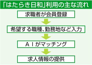「はたらき日和」の主な流れは求職者が会員登録し、希望する職種、勤務地など12項目を入力すると、AIが条件に合う求人情報を探し出し、情報提供する。希望に合致する項目が多いほど、マッチング率...