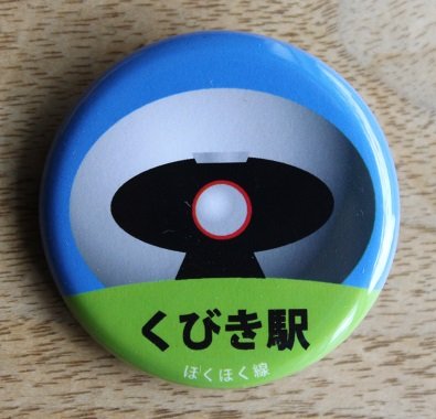 ほくほく線の車両や駅をデザインした缶バッジが見える。