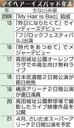 観衆は誰もいない。故郷の空へ、楽器を奏で、声を届けた。昨年10月、「My Hair is Bad(マイヘア― イズ バッド)」は新潟県上越市の高田城址(じょうし)公園野球場にいた。無観客での映像収録という異例の形の“ライブ”。ボーカル&ギター椎木知仁(ともみ)(28)は「ここにお客さんがいたら、もっともっと夢中になれる気がする」とつぶやいた。