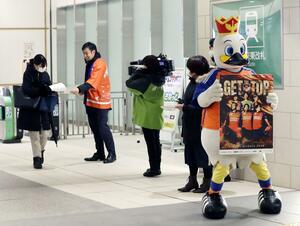 チラシは、ホーム開幕戦となる3月9日の名古屋戦への無料観戦招待を案内しており、通勤客や学生らが受け取っていた。