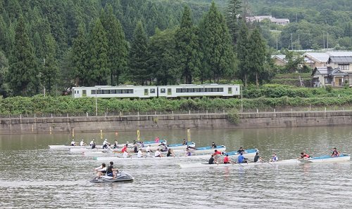 県立津川漕艇場で開かれた「第26回阿賀野川レガッタ」に知人が参加するという。