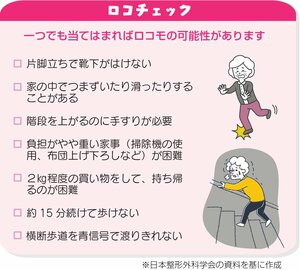 ロコモは運動器の障害によって、立ったり歩いたりするための身体能力(移動機能)が低下した状態です。運動器とは骨や関節(軟骨)、筋肉、手足にある末梢(まっしょう)神経や脊髄神経などで、移動や運動をつかさどり、自立して生活をするために重要な器官です。