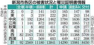 新潟市では1万3841棟の被害が確認され、全壊92棟、半壊2569棟、一部破損1万1180棟。市に寄せられた罹災(りさい)証明書の申請件数は1万4290件で、このうち交付されたのは8450件。被害認定調査が終了したのは1万5981件となった。