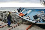 能登半島地震の津波で打ち上げられたとみられる漁船=1月2日、佐渡市羽茂地区