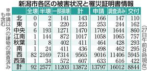新潟市では1万3872棟の被害が確認され、全壊92棟、半壊2577棟、一部破損1万1203棟。市に寄せられた罹災(りさい)証明書の申請件数(重複などを除く)は1万3797件で、このうち交付したのは8844件。被害認定調査が終了したのは1万6012件となった。