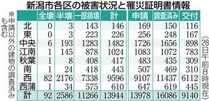 社会 地震・災害 能登半島地震 [能登半島地震]新潟県内の住宅被害1万9128棟、新潟市は1万3944棟(2月28日時点) 2024/2/28 19:30 (最終更新: 2024/2/29 10:33) 能登半島地震による新潟県内の住宅被害は、県のまとめによると、2月28日時点で1万9128棟に上った。県内全体で全壊101棟、半壊2677棟、一部破損1万6336棟となった。 新潟市では1万3944棟の被害が確認され、全壊92棟、半壊2586棟、一部破損1万1266棟。市に寄せられた罹災(りさい)証明書の申請件数(重複などを除く)は1万3978件で、このうち交付したのは9140件。被害認定調査が終了したのは1万6086件となった。 トップページで最新情報を見る 関連ニュース 能登半島地震の義援金、新潟市が2次配分額決める 住宅全壊世帯... 2/27 新潟市の液状化対策、実証実験を6月に着手 街区設定に私道も活... 2/26 能登地震の住宅応急修理相談窓口、新潟市西区役所は2月27日終... 2/21 [能登半島地震]液状化対策の住民負担、石川・富山県は「ゼロ」... 2/13 [能登半島地震関連]新潟県、義援金の2回目配分額を8億800... 1/30 [能登半島地震2年]「廃業」よぎったホテル寺尾(新潟市西区)... 1/29 【特集・動画あり】能登半島地震、津波迫る中で住民はどう動いた... 1/26 解体撤去された佐潟(新潟市西区)の野鳥観察舎、同じ場所に新設... 1/22 [能登半島地震2年]新潟市内の復旧状況は?住宅支援2万560... 1/9 新潟市の液状化対策工事、着工は早くて2028年 能登半島地震... 1/7 [能登半島地震2年]液状化被害の新潟市「みなし仮設」に今も2... 1/3 [羽田空港衝突事故から2年]滑走路の誤進入対策へ警告灯導入急... 1/2