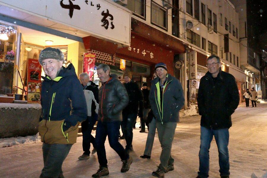 夜は「お楽しみ第2部」だ。まずは赤倉温泉の定宿・老舗「お宿ふるや」で温泉に漬かり、スキーの疲れを癒やす。毎年変わらず歓迎し、もてなしてくれ、ロバートさんは来るたびに「妙高に戻ってきた」と思う。