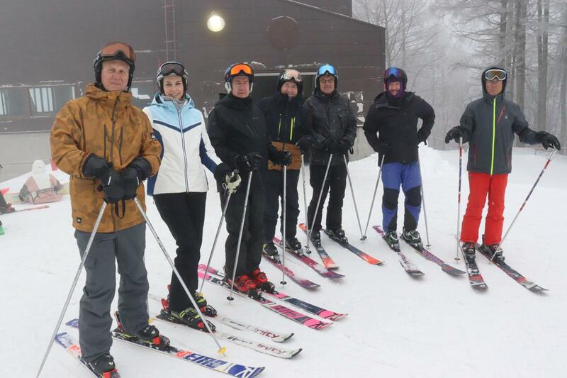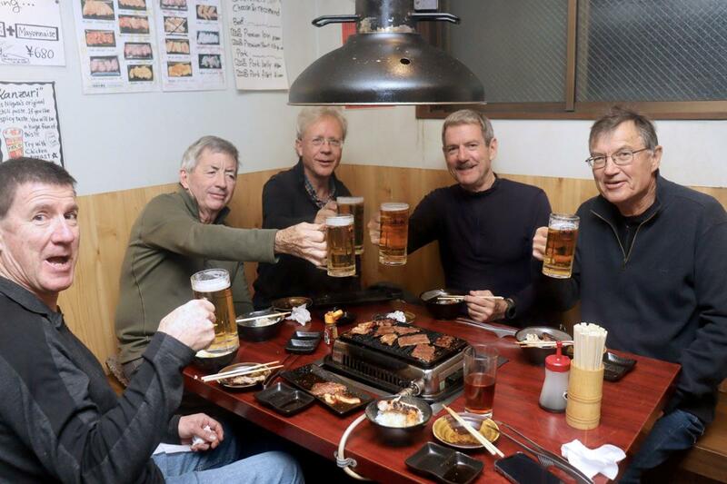 妙高へスキーをしに訪れたロバート・ブランクさん(左から2人目)ら。滞在中は他にもお好み焼きやラーメン、餃子などの日本食を楽しんだ=妙高市赤倉