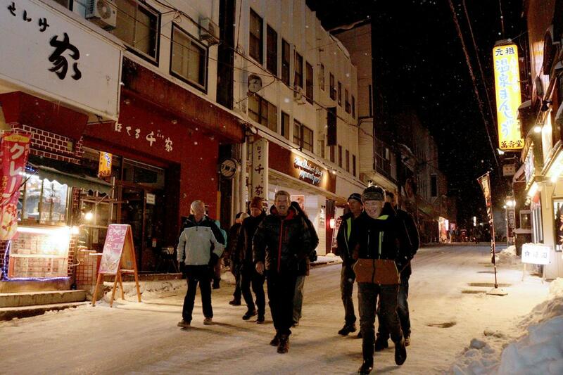 スキーから旅館に戻って温泉などを楽しんだ後、食事へ向かうロバート・ブランクさんら=妙高市赤倉