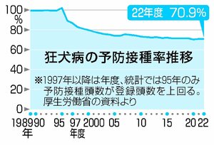 犬の狂犬病狂犬病ウイルスに感染した犬や猫などにかまれたり、ひっかかれたりした傷口から感染する。水を怖がる「恐水症」や高熱、全身けいれんが起き、昏睡(こんすい)状態から呼吸が停止し死に至る。ワクチンを巡り、4〜6月に接種するとしている規定を通年に広げるよう厚生労働省が見直しを検討していることが2月28日、厚生労働省への取材で分かった。2024年度、全市区町村を対象に接種の実態を調査した上で、25年度中に...