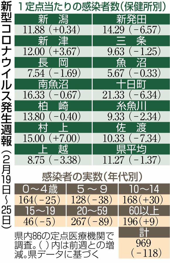 新潟県は2月29日、県内86の定点医療機関から19〜25日の1週間に報告された新型コロナウイルスの感染者が969人で、1医療機関当たりの平均は11・27人だったと発表した。前週(12〜18日)の12・64人の0・89倍となり、3週連続で減少した。