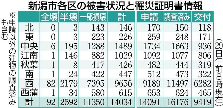 新潟市に寄せられた罹災(りさい)証明書の申請件数(重複などを除く)は1万4091件で、このうち交付したのは9419件。被害認定調査が終了したのは1万6176件となった。