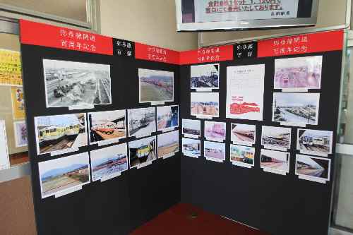 改札を抜けて右手に、弥彦線の過去を振り返る古い写真の展示コーナーがあった。