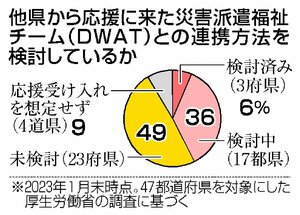避難所で高齢者や障害者らをケアする「災害派遣福祉チーム高齢者や障害者らを避難所で支援する専門チーム。各都道府県が地域の社会福祉協議会などと設け、登録した介護福祉士や社会福祉士、保育士らが災害時に活動する。」(DWAT)を巡り、都道府県の約半数は他県から入る応援組の受け入れ手順など、連携方法を具体的に検討していないことが昨年1月末時点での厚生労働省の調査で分かった。自治体職員や...