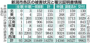 新潟市では1万4370棟の被害が確認され、全壊93棟、半壊2628棟、一部破損1万1649棟。市に寄せられた罹災(りさい)証明書の申請件数(重複などを除く)は1万4346件で、このうち交付したのは9963件。被害認定調査が終了したのは1万6527件。