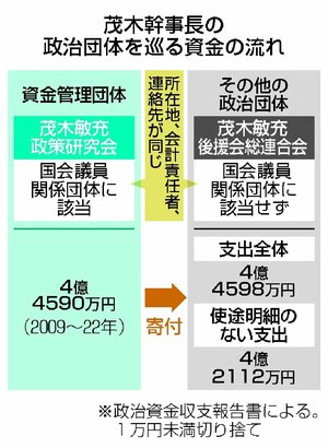 自民党の茂木敏充幹事長の資金管理団体が、使途公開基準の緩い政治団体「茂木敏充後援会総連合会」に毎年多額の資金を寄付して支出の具体的な内容が分からなくなっている問題で、寄付による資金移動が2009〜22年の14年で4億4590万円に上ることが3月6日、政治資金収支報告書政治団体の1月1日から12月31日までの収入と支出、保有資産を記した報告書。政治資金規正法が作成と公表を義務付けており、3年間閲覧できる。政党や政治資金団体、複数の都道府県で活動する政治団体は総務大臣に、一つの都道府県で活動する団体は都道府県選挙管理委員会に提出する。年間5万円を超える寄付(献金)や政治資金パーティーで20万円超の支払いを受けた相手の氏名や金額なども記載。100万円超の貸付金や借入金も記入する必要がある。の分析で分かった。後援会...
