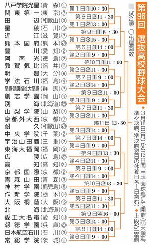 スポーツ 高校野球 [選抜高校野球大会・センバツ2024]2連覇狙う山梨学院は京都外大西と対戦、能登半島地震で被災の日本航空石川は常総学院と初戦 甲子園球場で3月18日開幕 2024/3/9 8:00 第96回選抜高校野球大会の組み合わせ抽選会が3月8日、大阪市内で開かれ、出場32校の対戦カードが決まった。史上4校目の大会2連覇が懸かる山梨学院は京都外大西と対戦。大会は甲子園球場で3月18日から13日間... 残り296文字(全文:399文字) ここから先を読むには 続きを読む(会員登録する) 続きを読む(ログイン) 新潟日報朝刊を購読していますか? はい いいえ トップページで最新情報を見る 関連ニュース 【速報】来春のセンバツ21世紀枠、新潟県推薦校に六日町高校 17:00 [明治神宮野球大会高校の部]新潟県勢全戦績まとめ 県勢が持つ... 11:50 イチローさん“思い出”の悠久山で柵越え!中越高球児らにイチ流... 11/9 [明治神宮野球大会高校の部]出場校出そろい、帝京長岡は唯一の... 11/9 北信越高校野球大会Vの帝京長岡、明治神宮大会初優勝へ闘志!長... 11/7 ソフトバンク育成1位指名の池田栞太選手(関根学園高)「泥臭く... 10/30 [明治神宮野球大会高校の部]帝京長岡の初戦の相手、四国代表の... 10/26 ソフトバンク、育成ドラフト1位で関根学園高の池田栞太捕手を指... 10/23 [秋の高校野球・北信越2025]歴史が動いた!「投・走」の帝... 10/21 【秋の高校野球・北信越2025】帝京長岡の逆転V「夢みたい」... 10/19