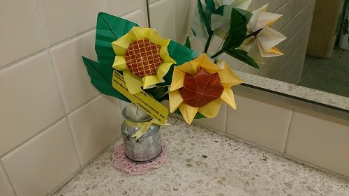手洗いの鏡の下に、夏の名残のようなヒマワリが飾ってあった。