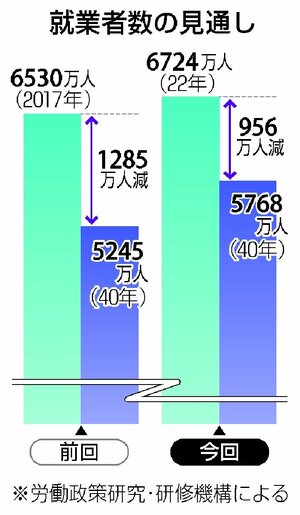 厚生労働省所管の労働政策研究・研修機構は3月11日、経済成長がない「ゼロ成長」で高齢者や女性らの労働参加が進まなかった場合、2040年の就業者数は22年比で956万人減の5768万人になるとの推計を公表した。人口減少が主な要因。一方で18年度に...