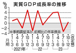 経済 GDP年率で0・4%増、2四半期ぶりプラス成長に転換・2023年10~12月期改定値 個人消費弱く、海外経済の減速など不安材料も 2024/3/12 16:00 (最終更新: 2024/3/29 15:29) 内閣府が3月11日に発表した2023年10〜12月期の国内総生産(GDP、季節調整済み)改定値は、物価の変動を除いた実質で前期比0・1%増、年率換算は0・4%増だった。年率0・4%減だった速報値から2四半期ぶりの... 残り572文字(全文:679文字) ここから先を読むには 続きを読む(会員登録する) 続きを読む(ログイン) 新潟日報朝刊を購読していますか? はい いいえ トップページで最新情報を見る 関連ニュース 信越化学、米国に5300億円投資 工場新設、塩化ビニール樹脂... 18:30 ふるさと新潟に新たなビジネスモデルを!株式上場で大きな資金呼... 15:00 JA北新潟(新発田市)が物流センター開設、肥料の大量仕入れが... 13:30 [倒産情報]キャンプ場運営のnature woods(村上市... 12:15 燕市の工業団地に本格サウナ!金属洋食器メーカー・青芳が開業 ... 11:45 新潟県内1月の有効求人倍率1・37倍、3カ月ぶり低下 雇用情... 8:30 【独自】2025年県産日本酒の国内出荷、3年連続減 1989... 5:00 「アレッタ」知ってる?JAえちご中越(長岡市)が出荷拡大へ研... 3/4