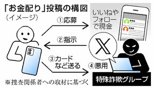 現金を配布すると呼びかける「お金配り」の投稿がX(旧ツイッター)交流サイト(SNS)の一つで、利用者はパソコンやスマートフォンから文章や写真、動画を投稿できる。他のユーザーはそれに返信したり転載したりすることが可能で、企業や公的機関、政治家の公式発表の場としても利用される。で相次いでいる。だが、実際にもらえるのはまれ。一部は特殊詐欺グループの関与が疑われ、17万人がフォローするアカウントもあった。応募した女性は伝えた口座情報が悪用され、警察の...