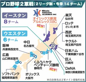 イースタンは8球団で、オイシックスの他にDeNA、巨人、ヤクルト、ロッテ、楽天、西武、日本ハム。ウエスタンは6球団で、くふうハヤテの他は阪神、広島、中日、オリックス、ソフトバンクが所属する=地図参照=。