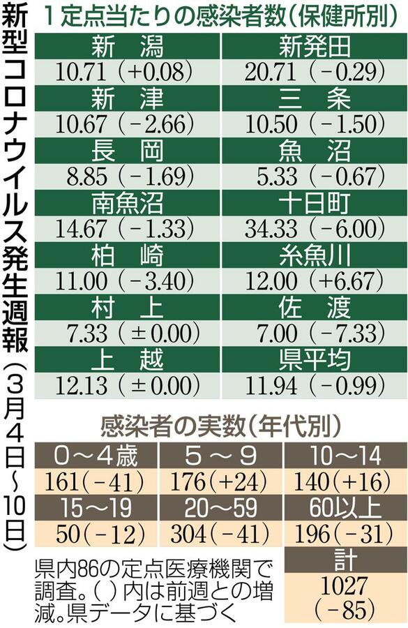 新潟県は3月14日、県内86の定点医療機関から4〜10日の1週間に報告された新型コロナウイルスの感染者が1027人で、1医療機関当たりの平均は11・94人だったと発表した。前週(2月26日〜3月3日)の12・93人の0・92倍となり、2週ぶりに減少した。