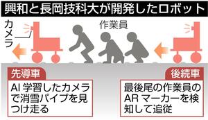 土木工事の興和(新潟市中央区)と長岡技術科学大学(新潟県長岡市)は、降雪期の前に消雪パイプを調整する作業員の安全を守るため、人工知能(AI)技術で自動走行し、通行車両に注意を促すロボットを開発した。作業員の前を走る先導車と後ろに付く後続車の2台一組で、いずれもカメラを搭載し消雪パイプや人を検知する。交通誘導員ら人手の削減につながる技術で、来冬前の実用化を目指す。