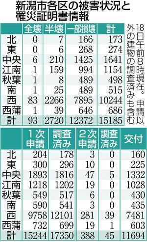 社会 地震・災害 能登半島地震 [能登半島地震]新潟県内の住宅被害は2万674棟、新潟市は1万5185棟(3月18日時点) 2024/3/18 18:00 (最終更新: 2025/1/20 16:38) 能登半島地震による新潟県内の住宅被害は、県のまとめによると、3月18日時点で2万674棟に上った。県内全体で全壊102棟、半壊2818棟、一部破損は1万7740棟となった。 新潟市では1万5185棟の被害が確認され、全壊93棟、半壊2720棟、一部破損1万2372棟。市に寄せられた罹災(りさい)証明書の申請件数(重複などを除く)は1万5244件で、このうち交付したのは1万1694件。被害認定調査が終了したのは1万7350件。 トップページで最新情報を見る 関連ニュース 能登半島地震の義援金受け付けを2027年3月31日まで延長 ... 12/13 [能登半島地震]被災住宅の公費解体、事業完了を新潟市長に報告... 12/9 「夕食難民」を救え! 地震で休業中、佐渡の老舗ホテルが和食居... 12/4 能登半島地震の被災者、避難の教訓語る 糸魚川市で防災講演会 12/3 [能登半島地震]新潟県内の住宅被害2万5415棟に・11月末時点 11/29 [能登半島地震の液状化対策事業]新潟市が地質の詳細調査へ、関... 11/26 [能登半島地震の液状化対策事業]新潟市が自治会別の説明会を開... 11/17 ビニールハウスや車…避難所以外で生活送る被災者への支援強化 ... 11/4 [能登半島地震]新潟県内の住宅被害2万5317棟に・10月末時点 11/1 [能登半島地震の液状化対策事業]自治体単位の説明会、新潟市が... 10/31 [能登半島地震の液状化対策事業]住民負担金巡り相次ぐ異論…全... 10/28 [能登半島地震の液状化対策事業]新潟市西区で全体説明会、住民... 10/11