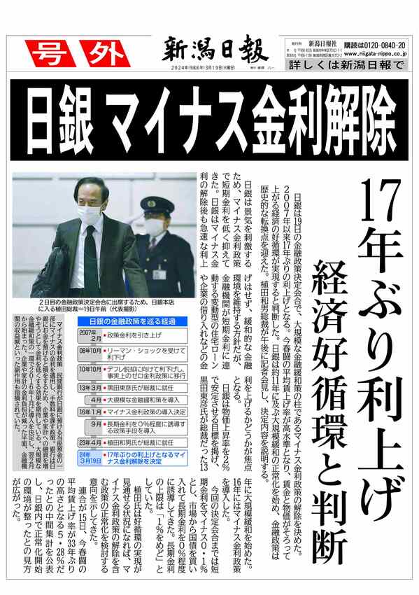 【号外】日銀がマイナス金利政策の解除決定、17年ぶり利上げ 2024/3/19 12:55 PDFで号外を見る トップページで最新情報を見る 関連ニュース 【温泉旅館特集】雪国の風土まるごと堪能♡ひなの宿ちとせ(十日... 11/30 米国のZ世代では当たり前?進学せず手に職望む若者の価値観とは... 11/30 デジタルの未来を学ぼう!新潟市中央区で12月3、4両日にイベ... 11/30 “妙高産”の販路拡大へ、オーストラリアに照準 新井商議所が地... 11/29 新潟県の農業経営体、5年で22%減 従事者の75%が65歳以... 11/29 新潟県内1等米比率75・1%、全国平均下回る 10月末時点、... 11/29 新潟県9月の鉱工業生産指数は前月比0.4%増の94.0 4カ... 11/28 業務改善の取り組み共有、三条市で「QCサークル」フォーラム ... 11/28 破産で解雇のJSファンダリ従業員、313人が再就職 新潟労働... 11/28 香り、うまみ、粘り…南魚沼産コシヒカリのおいしさ競う食味コン... 11/28 第四北越FGと群馬銀行、両社合わせた時価総額が上昇 「統合方... 11/28 コメリパワー黒埼店12月にオープン 店内に「雪梁舎ギャラリー... 11/28