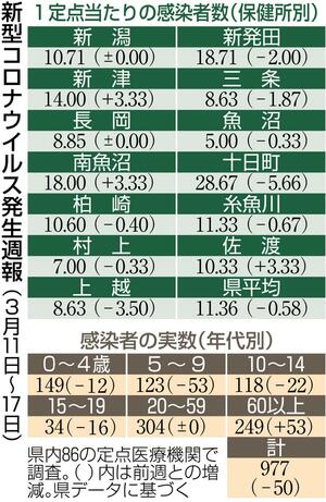 新潟県は3月21日、県内86の定点医療機関から11〜17日の1週間に報告された新型コロナウイルスの感染者が977人で、1医療機関当たりの平均は11・36人だったと発表した。前週(4〜10日)の11・94人から微減し、2週連続で減少した。