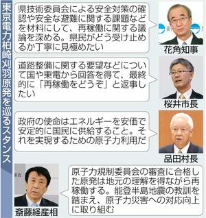 東京電力柏崎刈羽原発新潟県の柏崎市、刈羽村にある原子力発電所で、東京電力が運営する。1号機から7号機まで七つの原子炉がある。最も古い1号機は、1985年に営業運転を始めた。総出力は世界最大級の約821万キロワット。発電された電気は関東方面に送られる。2012年3月に6号機が停止してから、全ての原子炉の停止状態が続いている。東電が原発を再稼働させるには、原子力規制委員会の審査を通る必要がある。7号機は2020年に全ての審査に「合格」したが、安全対策を施している最中で、再稼働していない。の再稼働東京電力福島第1原発事故を踏まえ、国は原発の新規制基準をつくり、原子力規制委員会が原発の重大事故対策などを審査する。基準に適合していれば合格証に当たる審査書を決定し、再稼働の条件が整う。法律上の根拠はないが、地元の自治体の同意も再稼働に必要とされる。新潟県、柏崎市、刈羽村は県と立地2市村が「同意」する地元の範囲だとしている。を目指し、経済産業省資源エネルギー庁の村瀬佳史長官が3月21日、新潟県の花角英世知事に再稼働を直接要請した。柏崎市と刈羽村の議会は早期の再稼働に賛成の意思を示しており、花角知事の判断が今後の焦点となる。ただ、避難道路の整備など山積する課題について村瀬氏から具体的な話はなく、政府の思惑通りに再稼働が進む状況にはなっていない。
