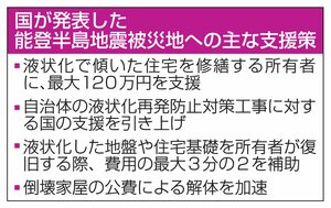政治・行政 能登半島地震 [能登半島地震]液状化被害の住宅修繕に最大120万円補助、新潟県などへの支援を政府が拡充 耐震改修も実施で工事費8割まで助成 2024/3/23 6:00 (最終更新: 2025/1/20 16:26) 政府は3月22日、能登半島地震の復旧・復興支援本部で、新潟、富山、石川3県を中心とした宅地の液状化被害への支援拡充策を表明した。地震で傾いた住宅の修繕に最大120万円を補助。被災自治体の再発防止事業に対する国の補助率を... 残り728文字(全文:838文字) ここから先を読むには 続きを読む(会員登録する) 続きを読む(ログイン) 新潟日報朝刊を購読していますか? はい いいえ トップページで最新情報を見る 関連ニュース [いま一度確かめたい]新潟県内、液状化のしやすさは? 国土交... 2024/1/9 [能登半島地震]液状化被害の宅地補強を半額支援、傾いた住宅の... 2024/3/22 [能登半島地震]液状化被害激しい新潟西区で新潟大・卜部厚志教... 2024/3/19 [能登半島地震]液状化エリア、阪神大震災上回る 新潟など4県... 2024/3/15 [能登半島地震]液状化被害深刻な新潟西区寺尾地区、私道の復旧... 2024/3/15 能登半島地震の義援金受け付けを2027年3月31日まで延長 ... 12/13 [能登半島地震]被災住宅の公費解体、事業完了を新潟市長に報告... 12/9 「夕食難民」を救え! 地震で休業中、佐渡の老舗ホテルが和食居... 12/4 能登半島地震の被災者、避難の教訓語る 糸魚川市で防災講演会 12/3 [能登半島地震]新潟県内の住宅被害2万5415棟に・11月末時点 11/29 [能登半島地震の液状化対策事業]新潟市が地質の詳細調査へ、関... 11/26 [能登半島地震の液状化対策事業]新潟市が自治会別の説明会を開... 11/17