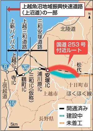 新潟県上越地域と魚沼地域を結ぶ高規格道路「上越魚沼地域振興快速道路(上沼道)」で未着工となっている上越市安塚区-十日町市松代の区間について、県は3月25日、大まかな建設ルート2案のうち、国道253号付近を通る案を県の整備方針とすると発表した。周辺住民へのアンケート結果などを踏まえ、交通量の多い国道253号にアクセスしやすく、災害時などに代替路となれる点などから決めた。