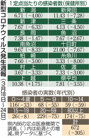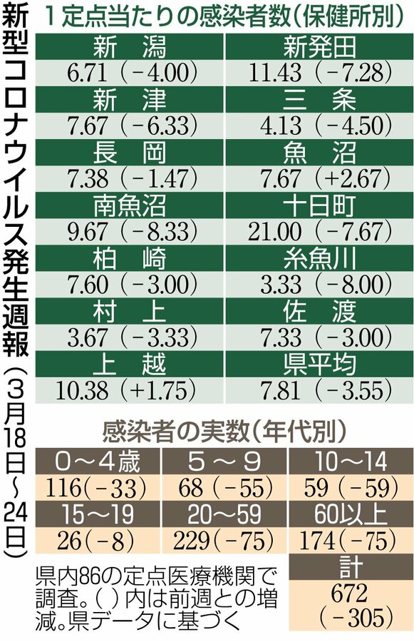 新潟県は3月28日、県内86の定点医療機関から18〜24日の1週間に報告された新型コロナウイルスの感染者が672人で、1医療機関当たりの平均は7・81人だったと発表した。前週(11〜17日)の11・36人の0・69倍となり、3週連続で減少した。