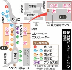 新潟交通(新潟市中央区)は3月31日、JR新潟駅(同)に新たなバスターミナルを開業する。駅の南北に分かれていた停留所の「新潟駅前」と「新潟駅南口」は、駅直結の新たな停留所「新潟駅」に統合されるなど、路線バス環境が大きく変わる=図参照=。