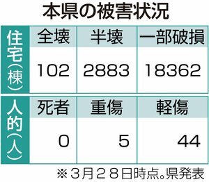 新潟県によると、県内の住宅被害は計25市町村で確認され、3月28日時点で、2万1361棟に上る。全壊が102棟、半壊が2883棟、一部破損が1万8362棟。津波による床下浸水...