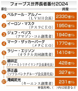 経済 まさに桁違い!2024年世界長者番付、1位の資産は…約35兆円!ファーストリテイリングの柳井正氏、ソフトバンクの孫正義氏は何位? 米フォーブス誌発表 2024/4/7 20:00 (最終更新: 2024/4/7 20:15) 【ニューヨーク共同】米誌フォーブスが発表した2024年版の世界長者番付で、フランスの高級ブランド大手、モエ・ヘネシー・ルイ・ヴィトン(LVMH)のベルナール・アルノー会長と家族が保有資産2330億ドル(約35兆円)で... 残り440文字(全文:549文字) この記事を読むには 会員登録が必要です 無料で会員登録して続きを読む 会員の方はこちら(ログイン) 会員のご案内 レギュラープラン【おすすめ】 すべての記事と紙面ビューアー(電子版)を無制限にお読みいただけます。 月額3,300円(税込み)。 新聞を購読されている方は無料です。 ライトプラン 無料記事と有料記事(レギュラープラン限定記事を除く)を月50本までお読みいただけます。 月額1,650円(税込み)。 無料会員 無料記事と有料記事を月2本までお読みいただけます。 無料で会員登録して続きを読む トップページで最新情報を見る 関連ニュース 東京ーニューヨーク間、宇宙経由で60分に 料金1億円、日本旅... 10/28 「おばちゃん社長」の経営法やDXを学ぼう! 11月5日、新潟... 10/28 「両津やまきホテル」(佐渡市)を東京の企業が取得に…地元から... 10/28 段ボールと堆肥で耕す手間いらず!?雑草も生えにくい不耕起栽培... 10/28 出来たてドーナツでほっと一息♪新発田市月岡温泉に「TSUKI... 10/28 首都圏と燕三条エリアで2地域居住を JR東のプロジェクト始動... 10/28 新潟商工会議所のトップを戦後最長4期12年、福田勝之会頭が最... 10/28 【独自】2022年に営業停止の「両津やまきホテル」(佐渡市)... 10/28 [東証初の5万円突破]新潟県内企業は歓迎の一方「地方経済と乖... 10/27 新たなビジネスで地域経済活性化に貢献!大光銀行「ビジネスアワ... 10/27 魚沼産コシヒカリ×モツ焼き、天ぷら…新米と山のごっつぉ楽しん... 10/27 [人事]第一建設工業(25年10月27日付、11月1日付) 10/27 特集・連載 [新潟県の地域別感染症情報]マイコプラズマ肺炎、インフルエン... 10/23 【高校入試・新潟】最新情報&お役立ち情報まとめ 倍率・過去問も 7/28 漫画で知る「うつ病」とは? 若手社員が休職→通院→復職するま... 6/13 [紅葉スポット×花スポット]新潟県内の紅葉や花畑、映える名所... 5/29 【猫動画あり・新作追加】新潟県内「猫のいる店」♡モフモフに触... 8/27 [WEリーグ]今からでも間に合う!アルビレックス新潟レディー... 8/14 【機動戦士ガンダムジークアクス】鶴巻和哉監督(五泉市出身)が... 8/4 [プロ野球ドラフト会議]プロ志望届、新潟県関係は7人が提出!... 10/9 Otona+ 今や「1兆円市場」冷凍食品はなぜ愛されるのか?県民に人気の商... 10/28 【動画あり】新潟の夜空染めたオーロラ、実は江戸時代にも目撃さ... 10/21 卵子提供で2児出産、自助グループ立ち上げ当事者に寄り添い…芸... 10/14 山頂に神社、小学校の屋上…各地に点在する「三角点」って?形は... 9/30 「アクシアル」「コメリ」などプライベートブランド開発の裏側お... 9/23