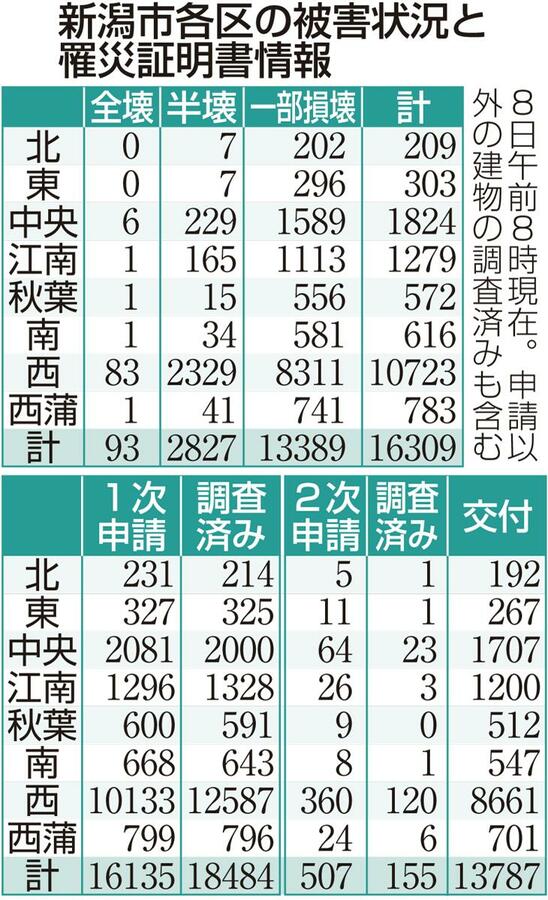 新潟市では1万6309棟の被害が確認され、全壊93棟、半壊2827棟、一部破損1万3389棟。新潟市に寄せられた罹災(りさい)証明書の申請件数(重複などを除く)は1万6135件で、このうち交付したのは1万3787件。被害認定調査が終了したのは1万8484件となっている。