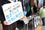 街頭で早期救済を訴えた新潟水俣病第5次訴訟の原告や支援者ら=4月8日、新潟市中央区