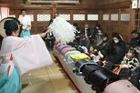 新潟県阿賀町恒例のイベント「つがわ狐(きつね)の嫁入り行列」にちなんで、キツネメークをデザインしたマスクと耳の飾りを着用しドライバーらに安全運転を呼びかける活動が4月9日、阿賀町の津川署で行われた。