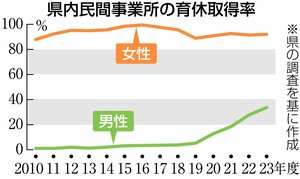 県調査によると、男性の育休取得率は10〜19年度は1〜5%台で推移し、全国平均とほぼ同水準か下回る状況が続いた。だが20年度以降は全国平均より高くな...