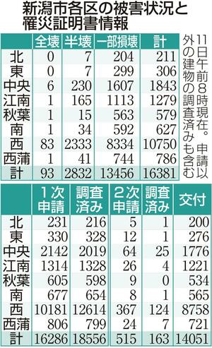 新潟市では1万6381棟の被害が確認され、全壊93棟、半壊2832棟、一部破損1万3456棟。新潟市に寄せられた罹災(りさい)証明書の申請件数(重複など除く)は1万6286件で、このうち交付されたのは1万4051件となった。外観に加えて家屋内部を調査する2次調査の申請件数は515件あり、調査を終えたのは163件となった。
