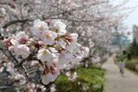 新潟市西蒲区の上堰潟(うわせきがた)公園で、桜と菜の花が見頃を迎えている。春らしい陽気に包まれた4月12日、家族連れら多くの人が訪れ、散策をしたり写真を撮ったりして、黄色と淡いピンク色のコントラストを満喫していた。
