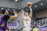 先発は大矢孝太朗、高橋克実、デイビス、クリスウェル、田中成也。第1クオーターはインサイドを中心に点を取り合う互角の展開。第2クオーターも競り合ったが、36-42で折り返した。