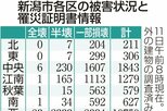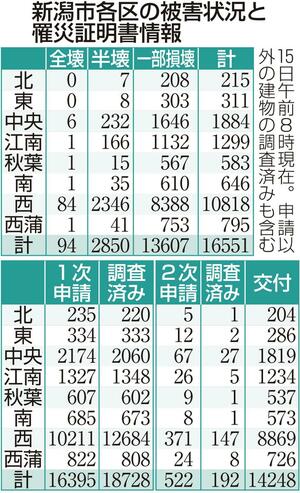 新潟市では1万6551棟の被害を確認し、全壊94棟、半壊2850棟、一部破損1万3607棟。市に寄せられた罹災(りさい)証明書の申請件数(重複など除く)は1万6395件で、このうち交付したのは1万4248件となった。